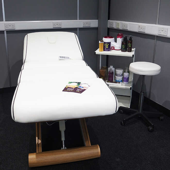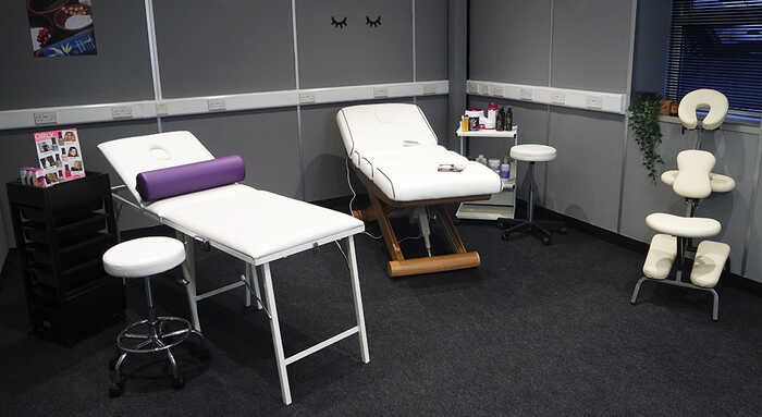 A large treatment room, equipped with pictured treatment furniture. Located at our Education Centre and Beauty Shop in Wellington, Somerset.