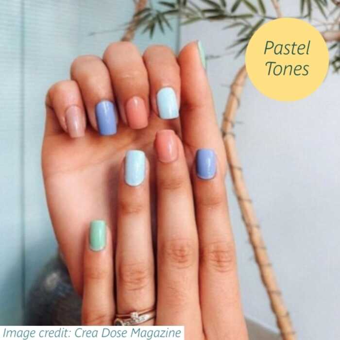 If bold, sunset brights aren’t the trend for you, then pastel tones are the one you’re going to want to tap into in 2021. Mix things up with your pastel colours; try painting each nail a different tone, or opt for on-trend pastel lilacs and mints for a statement, fashion look.